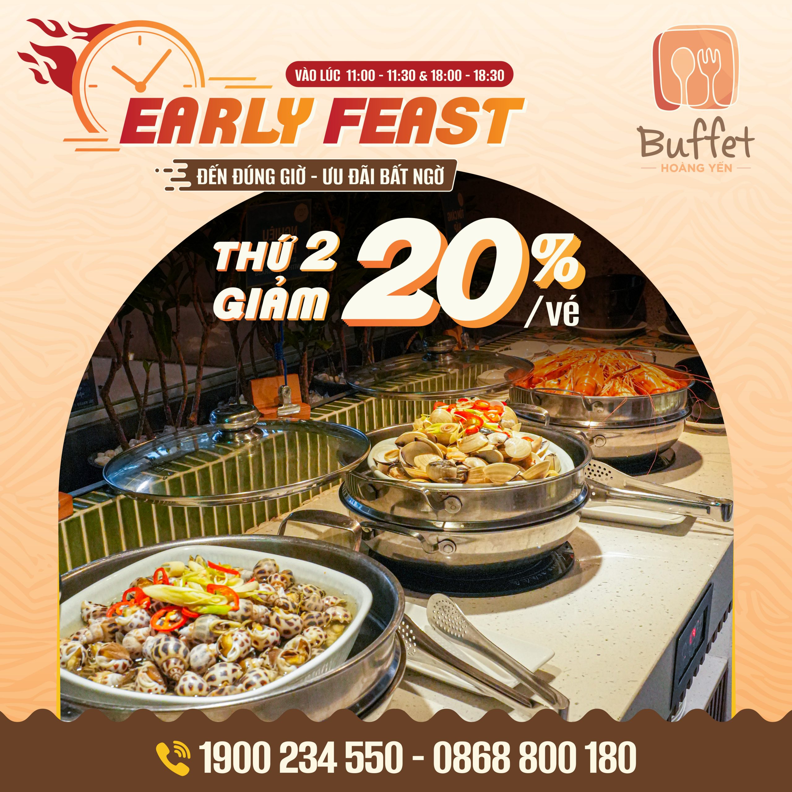 Nhưng tại Hoàng Yến Buffet, Thứ Hai không chỉ có sự chăm chỉ mà còn có những bất ngờ cực kỳ hấp dẫn! Để tiếp thêm năng lượng cho một tuần làm việc và học tập hiệu quả, Hoàng Yến Buffet gửi tặng bạn chương trình ưu đãi đặc biệt: EARLY FEAST – ĐẾN ĐÚNG GIỜ, ƯU ĐÃI BẤT NGỜ.
